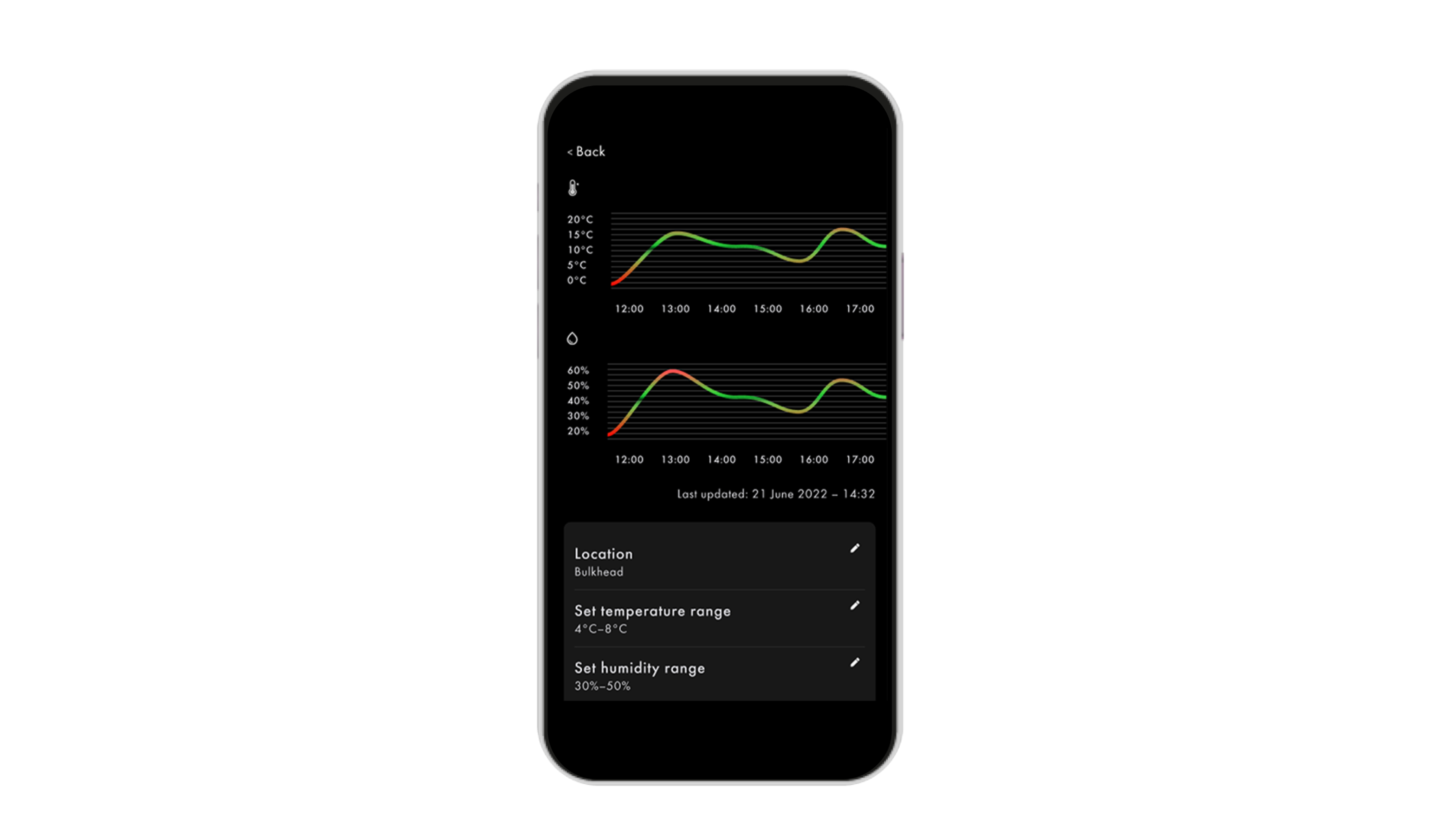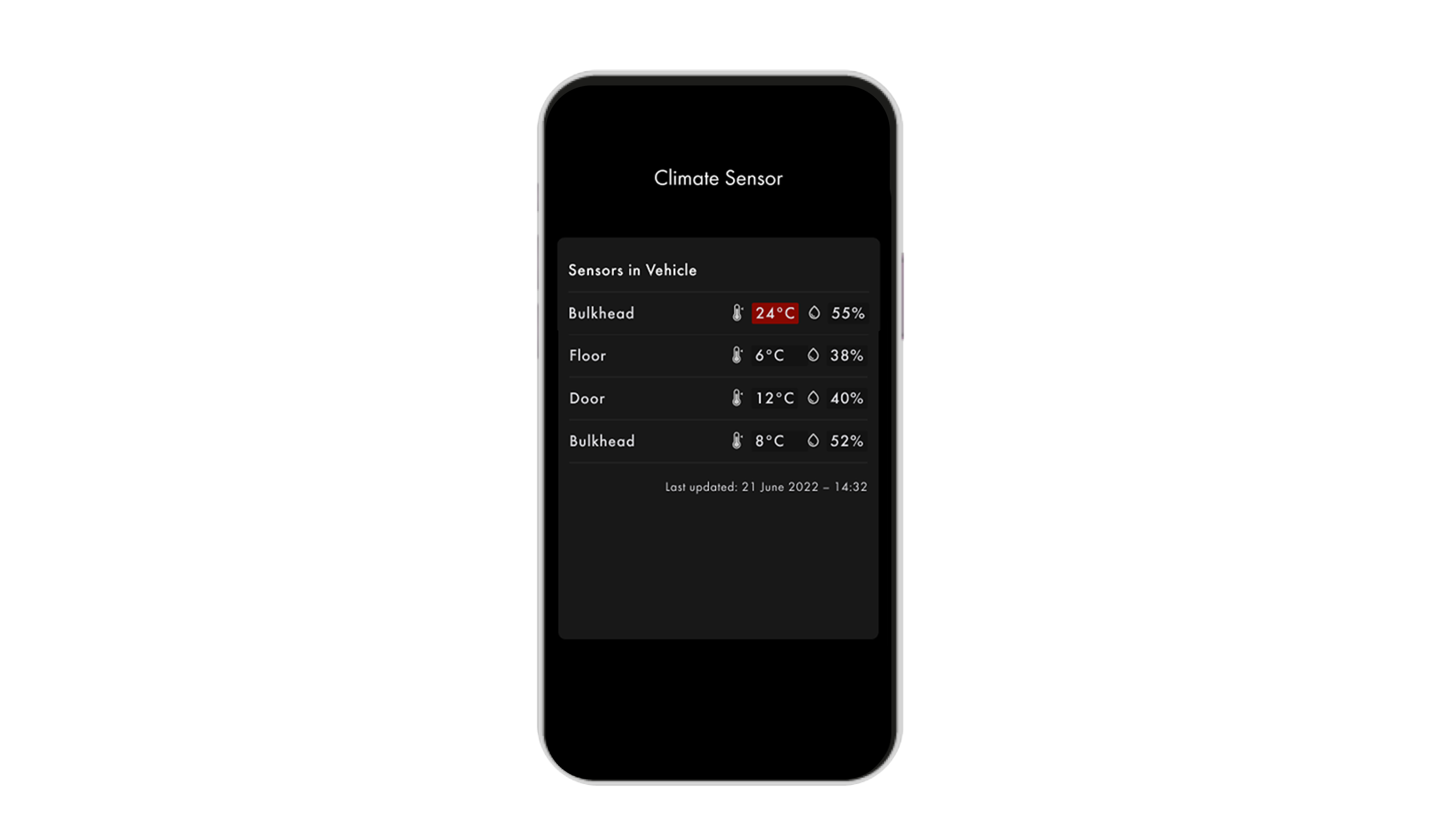 Obtenez une vue d'ensemble des conditions climatiques de votre véhicule et recevez des alertes immédiates en cas de dépassement des limites spécifiées, assurant ainsi une gestion proactive des niveaux de température et d'humidité.