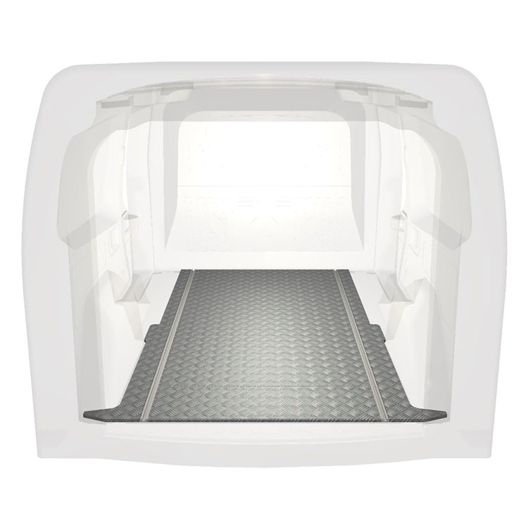 Plancher très long léger et robuste pour une Opel Combo / Fiat Doblò avec une plaque de roulement en aluminium antidérapant et des rails de chargement (longitudinaux) pour une installation rapide et sûre des systèmes de rayonnage et autres accessoires.
