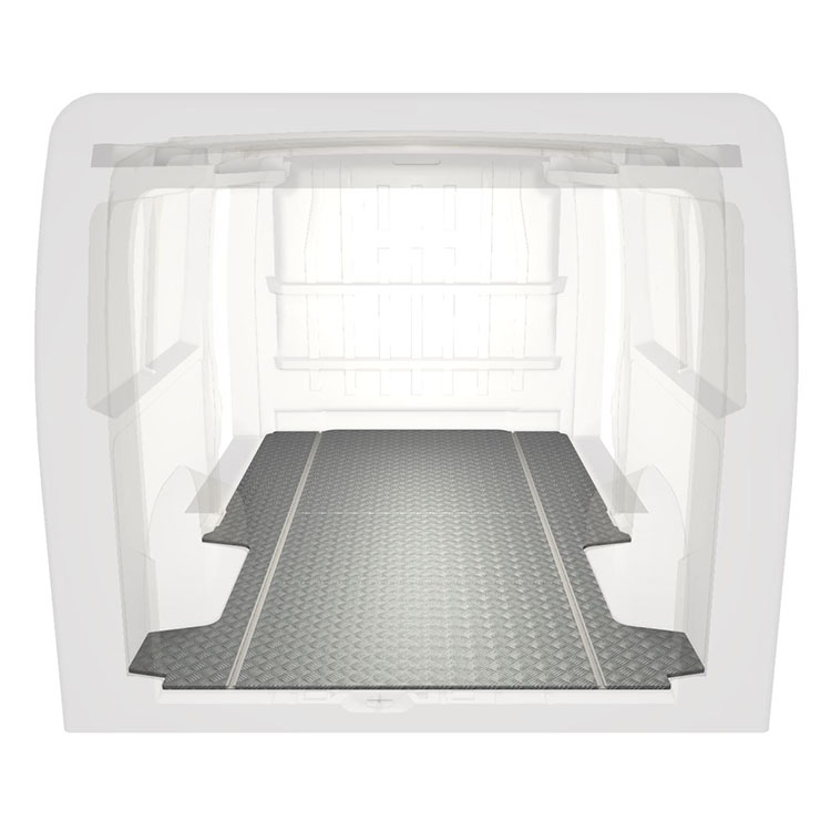 Plancher standard ultra-léger et robuste pour une Citroën Jumper / Peugeot Boxer / Fiat Ducato avec une plaque de roulement en aluminium antidérapant et des rails de chargement (longitudinaux) pour une installation rapide et sûre des systèmes de rayonnage et autres accessoires.