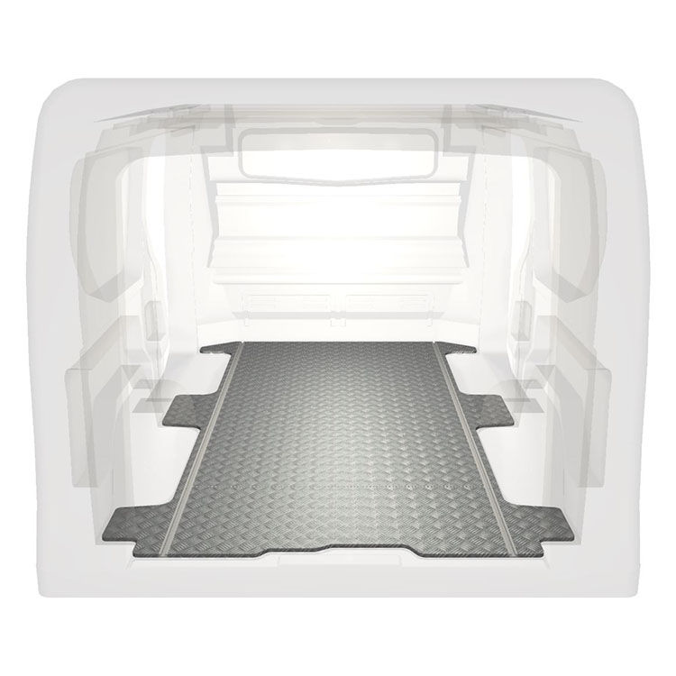 Plancher standard ultra-léger et robuste pour une Renault Trafic / Opel Vivaro / Fiat Talento / Nissan NV300 avec une plaque de roulement en aluminium antidérapant et des rails de chargement (longitudinaux) pour une installation rapide et sûre des systèmes de rayonnage et autres accessoires.