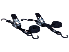 Sangle d'arrimage avec petit tendeur, crochets en S et sangle étroite. Longueur : 2 m. Force d'arrimage 250 kg (LC 125 daN). 2 pcs.