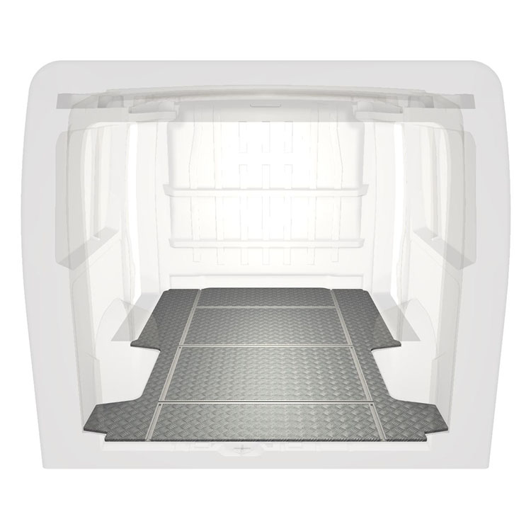 Plancher léger et robuste avec rails transversaux pour une Citroën Jumper / Peugeot Boxer / Fiat Ducato avec une plaque de roulement en aluminium antidérapant et des rails de chargement (longitudinaux et transversaux) pour une installation rapide et sûre des systèmes de rayonnage et autres accessoires.