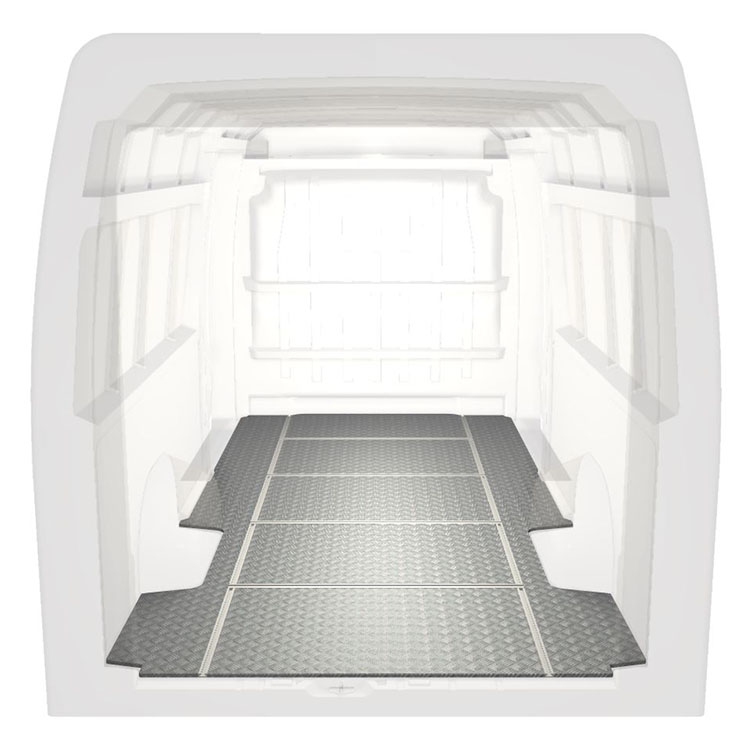Plancher léger et robuste avec rails transversaux pour une Citroën Jumper / Peugeot Boxer / Fiat Ducato avec une plaque de roulement en aluminium antidérapant et des rails de chargement (longitudinaux et transversaux) pour une installation rapide et sûre des systèmes de rayonnage et autres accessoires.