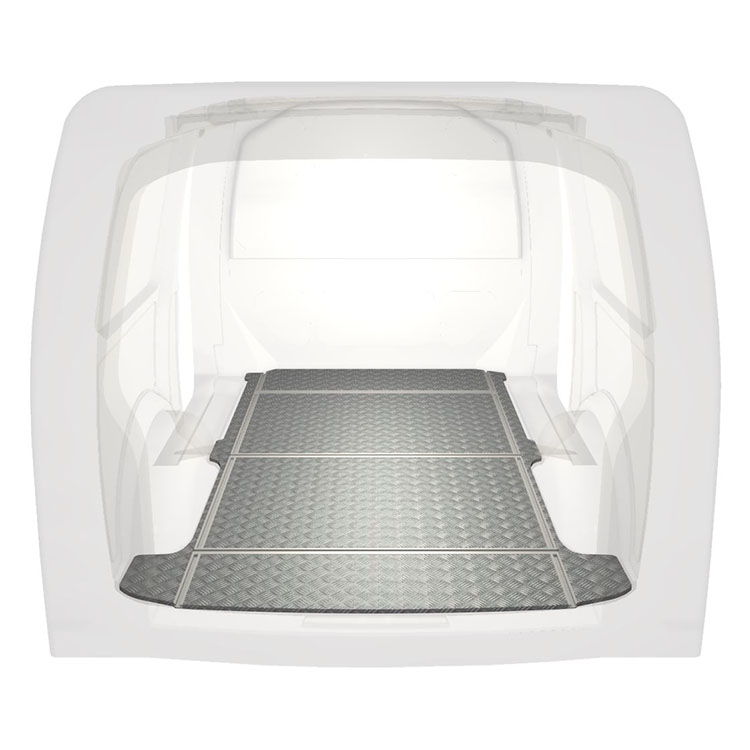 Plancher léger et robuste avec rails transversaux pour une Volkswagen Transporter T6 avec une plaque de roulement en aluminium antidérapant et des rails de chargement (longitudinaux et transversaux) pour une installation rapide et sûre des systèmes de rayonnage et autres accessoires.