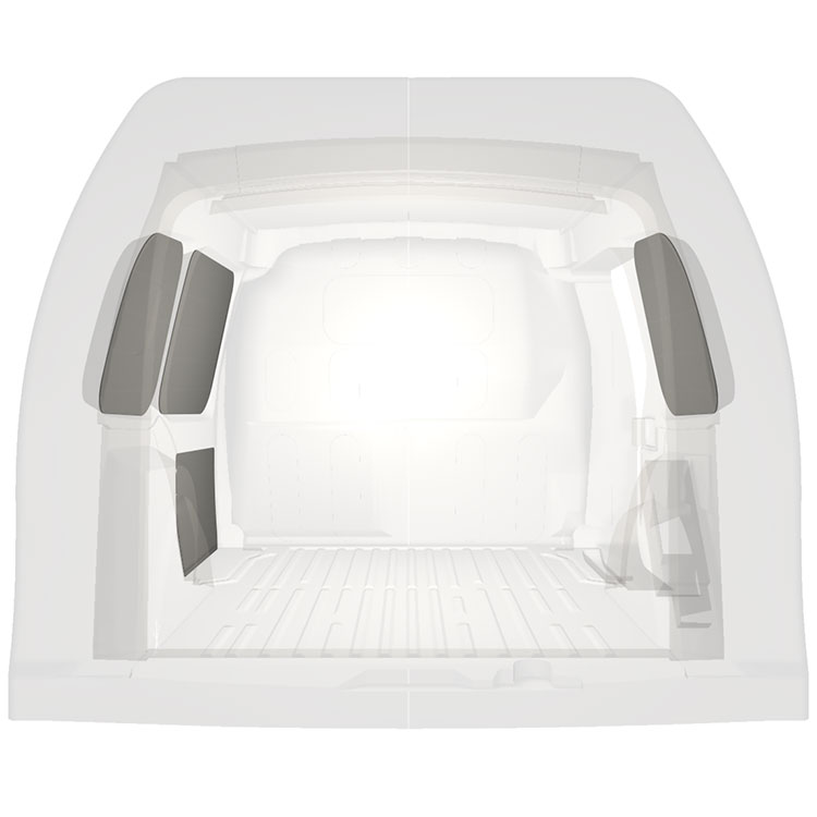 Revêtement de parois léger pour parois intérieures d’une Mercedes Citan / Renault Kangoo avec une porte latérale à droite. Les parois créeront un environnement professionnel lumineux et convivial et se nettoient facilement.