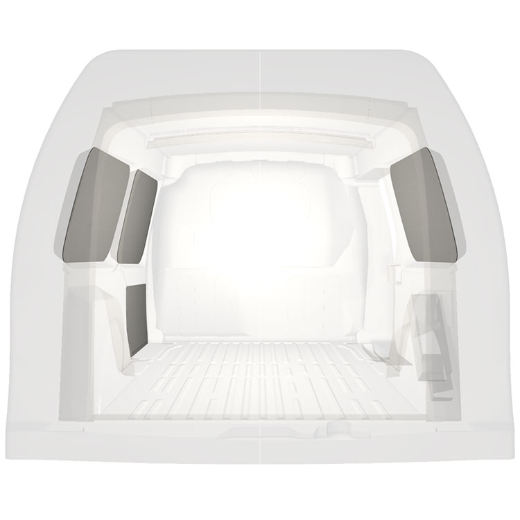 Revêtement de parois léger pour parois intérieures d’une Mercedes Citan / Renault Kangoo avec une porte latérale à droite. Les parois créeront un environnement professionnel lumineux et convivial et se nettoient facilement.