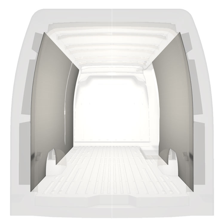 Revêtement entièrement léger pour parois intérieures d’une Renault Master / Opel Movano / Nissan NV400 avec une porte latérale à droite. Les revêtements créent un environnement professionnel lumineux et convivial et se nettoient facilement.