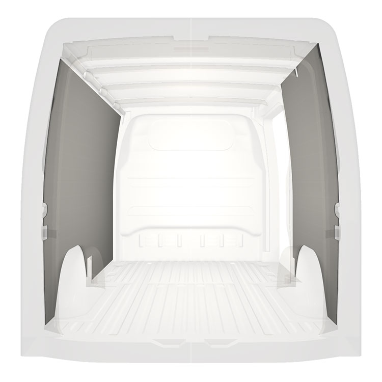 Revêtement entièrement léger pour parois intérieures d’une Mercedes Sprinter avec une porte latérale à droite. Les revêtements créent un environnement professionnel lumineux et convivial et se nettoient facilement.