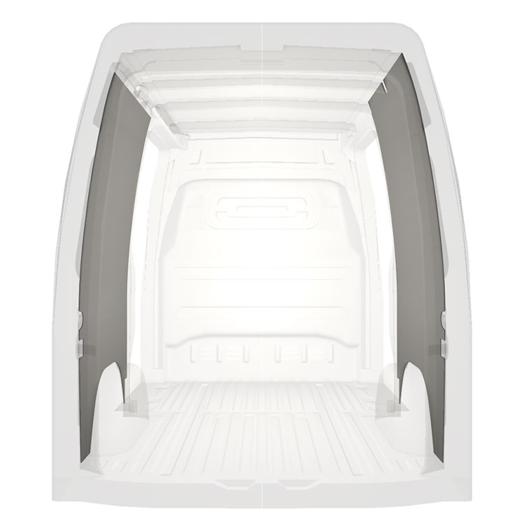 Revêtement entièrement léger pour les parois intérieures d’une Mercedes Sprinter avec doubles portes latérales. Les parois créeront un environnement professionnel lumineux et convivial et se nettoient facilement.
