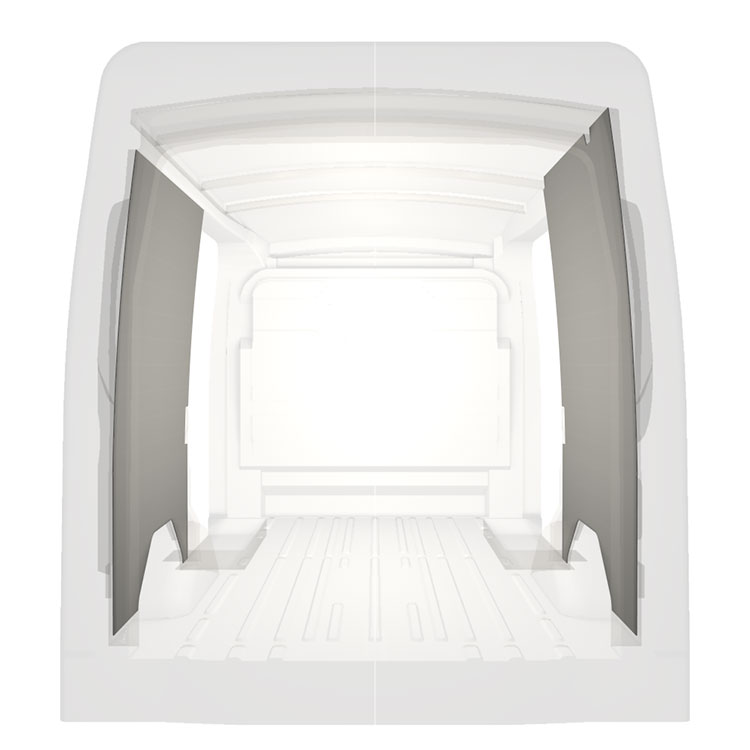 Revêtement entièrement léger pour les parois intérieures d’une Ford Transit avec doubles portes latérales. Les parois créeront un environnement professionnel lumineux et convivial et se nettoient facilement.