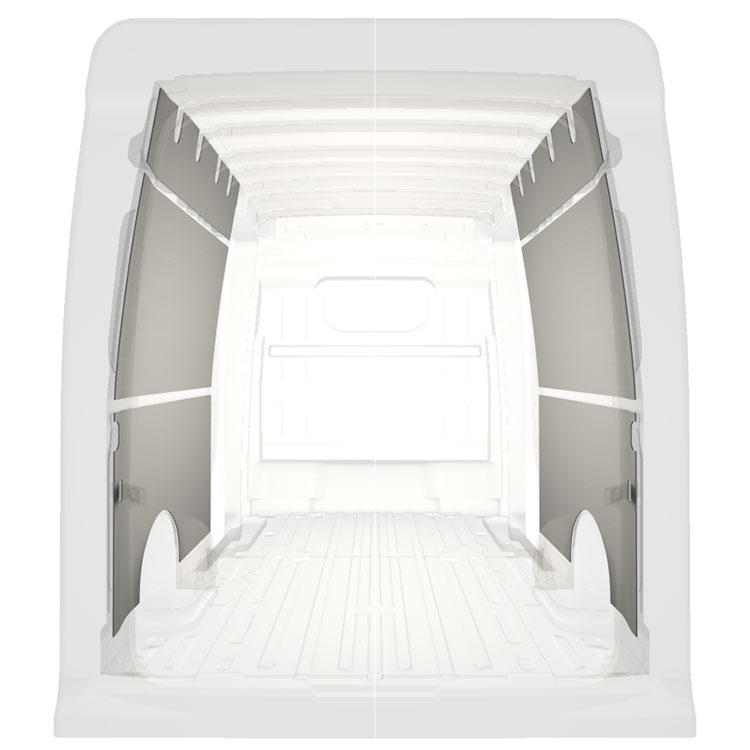 Revêtement léger pré-découpé pour les parois intérieures d’une Volkswagen Crafter / MAN TGE avec doubles portes latérales. Les parois créeront un environnement professionnel lumineux et convivial et se nettoient facilement.