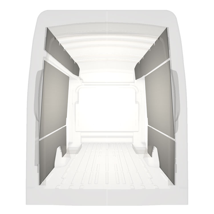 Revêtement léger pré-découpé pour les parois intérieures d’une Ford Transit avec doubles portes latérales. Les parois créeront un environnement professionnel lumineux et convivial et se nettoient facilement.