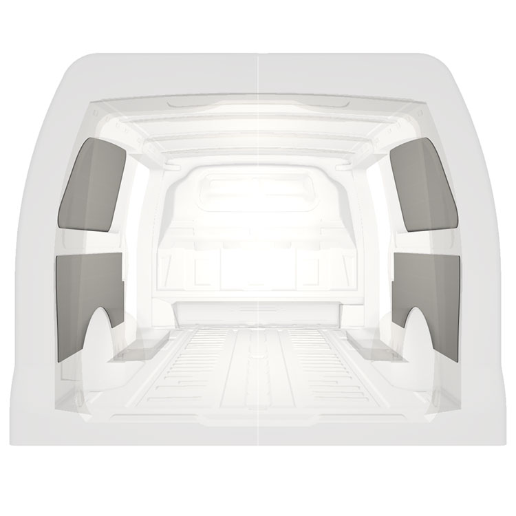 Revêtement léger pré-découpé pour les parois intérieures d’une Mercedes Vito avec doubles portes latérales. Les parois créeront un environnement professionnel lumineux et convivial et se nettoient facilement.