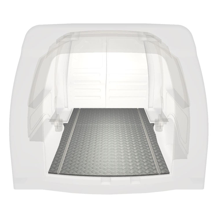 Plancher standard ultra-léger et robuste pour une Volkswagen Caddy Maxi avec une plaque de roulement en aluminium antidérapant et des rails de chargement (longitudinaux) pour une installation rapide et sûre des systèmes de rayonnage et autres accessoires.