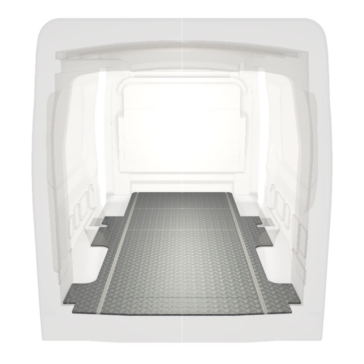 Plancher standard ultra-léger et robuste pour une Ford Transit avec une plaque de roulement en aluminium antidérapant et des rails de chargement (longitudinaux) pour une installation rapide et sûre des systèmes de rayonnage et autres accessoires.