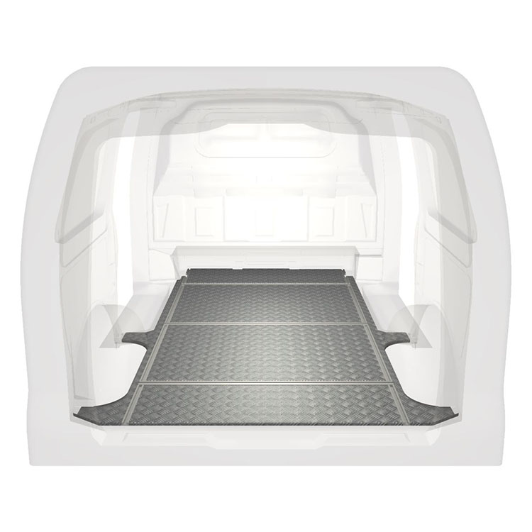 Plancher léger et robuste avec rails transversaux pour une Mercedes Vito avec une plaque de roulement en aluminium antidérapant et des rails de chargement (longitudinaux et transversaux) pour une installation rapide et sûre des systèmes de rayonnage et autres accessoires.