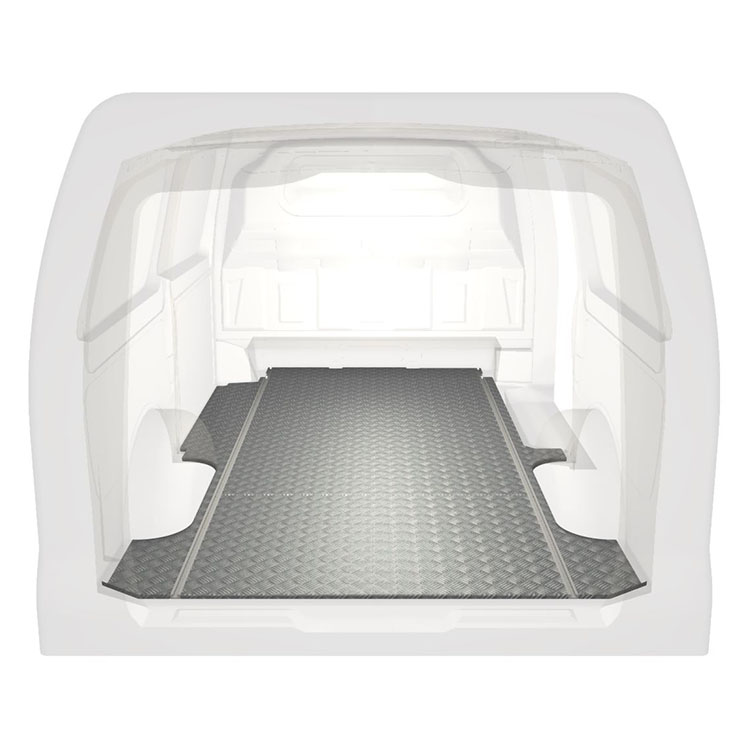 Plancher standard ultra-léger et robuste pour une Mercedes Vito avec une plaque de roulement en aluminium antidérapant et des rails de chargement (longitudinaux) pour une installation rapide et sûre des systèmes de rayonnage et autres accessoires.
