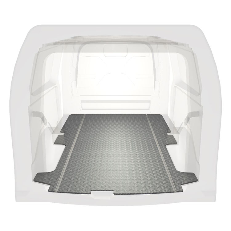 Plancher standard ultra-léger et robuste pour une Ford Transit Custom avec une plaque de roulement en aluminium antidérapant et des rails de chargement (longitudinaux) pour une installation rapide et sûre des systèmes de rayonnage et autres accessoires.