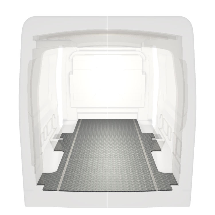 Plancher très long léger et robuste pour une Ford Transit avec une plaque de roulement en aluminium antidérapant et des rails de chargement (longitudinaux) pour une installation rapide et sûre des systèmes de rayonnage et autres accessoires.