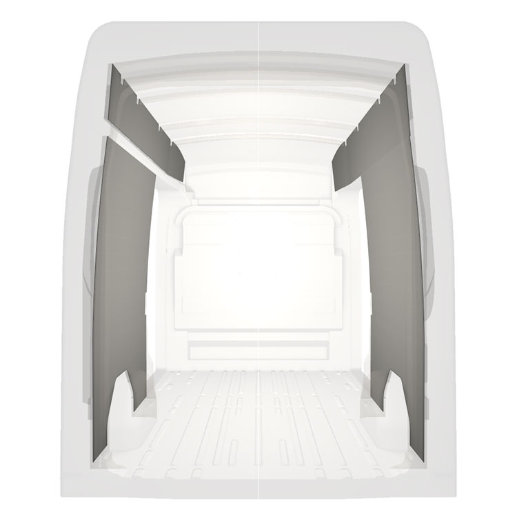 Revêtement entièrement léger pour les parois intérieures d’une Ford Transit avec doubles portes latérales. Les parois créeront un environnement professionnel lumineux et convivial et se nettoient facilement.