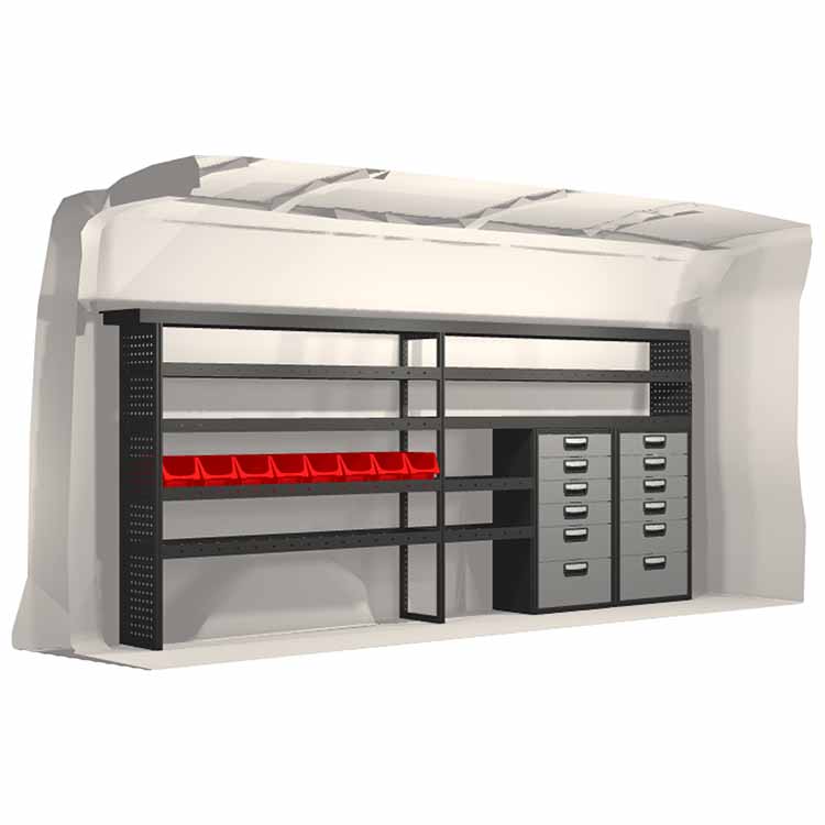 Ce système d’aménagement a été spécialement conçu pour assurer une adaptation optimale ainsi que la meilleure fonctionnalité et sécurité possible. Il a été développé pour un usage professionnel, est flexible et est destiné à des métiers de services dans des domaines variés. Toutes les étagères sont équipées de tapis caoutchouc, et tous les tiroirs de tapis mousse. Les composants d’assemblage et de fixation sont inclus.
