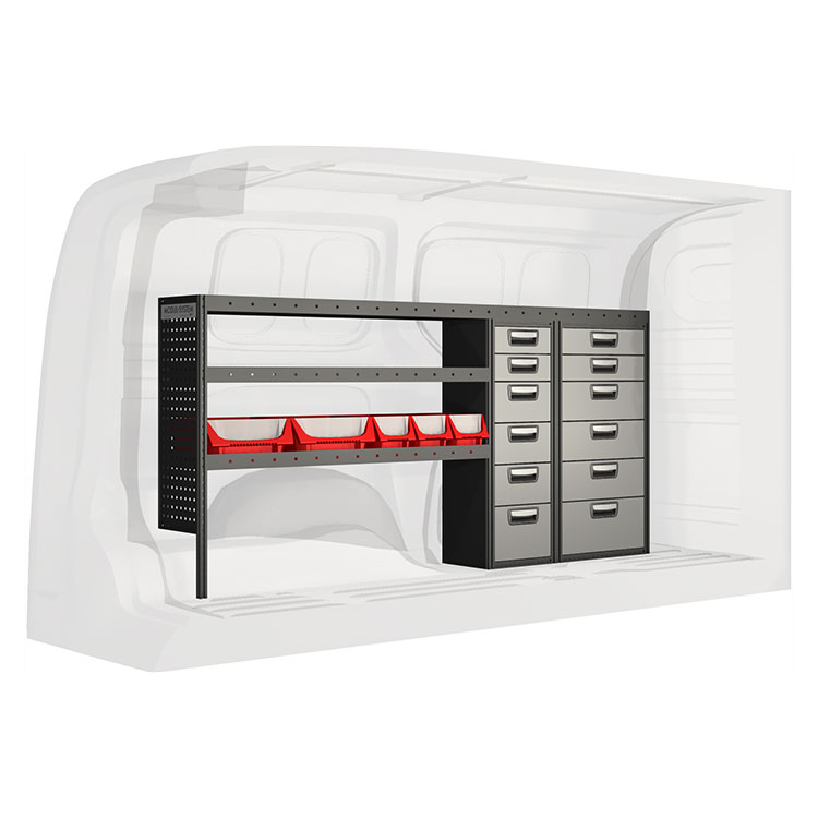 Ce système d’aménagement a été spécialement conçu pour assurer une adaptation optimale ainsi que la meilleure fonctionnalité et sécurité possible. Il a été développé pour un usage professionnel, est flexible et est destiné à des métiers de services dans des domaines variés. Toutes les étagères sont équipées de tapis caoutchouc, et tous les tiroirs de tapis mousse.