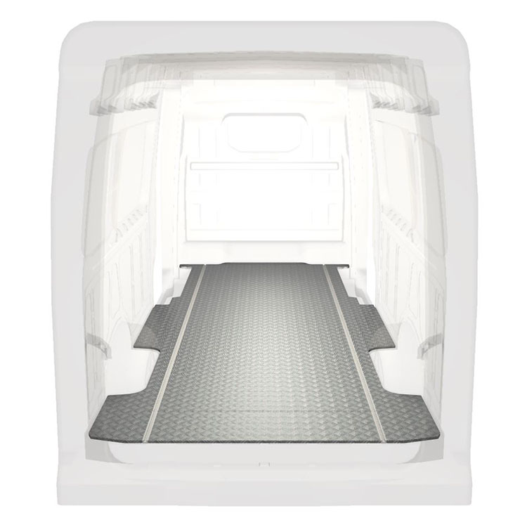Plancher standard ultra-léger et robuste pour une Volkswagen Crafter / MAN TGE avec une plaque de roulement en aluminium antidérapant et des rails de chargement (longitudinaux) pour une installation rapide et sûre des systèmes de rayonnage et autres accessoires.