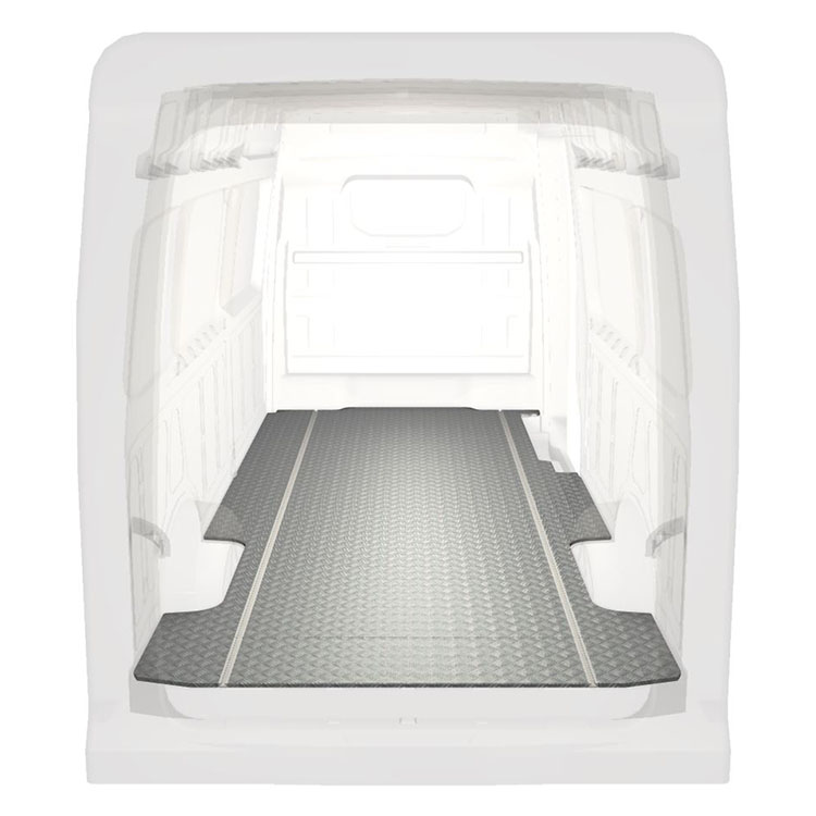 Plancher standard ultra-léger et robuste pour une Volkswagen Crafter / MAN TGE avec une plaque de roulement en aluminium antidérapant et des rails de chargement (longitudinaux) pour une installation rapide et sûre des systèmes de rayonnage et autres accessoires.