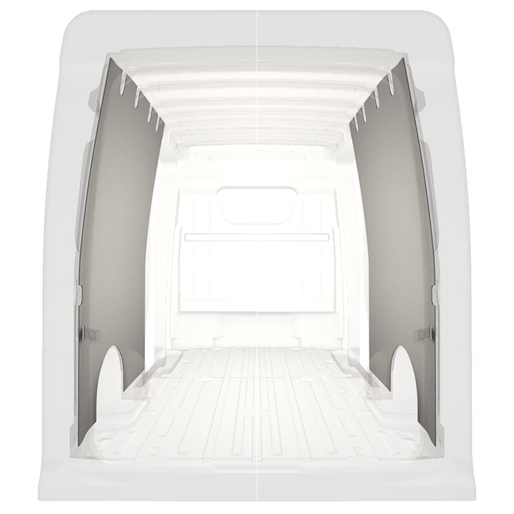 Revêtement entièrement léger pour les parois intérieures d’une Volkswagen Crafter / MAN TGE avec doubles portes latérales. Les parois créeront un environnement professionnel lumineux et convivial et se nettoient facilement.