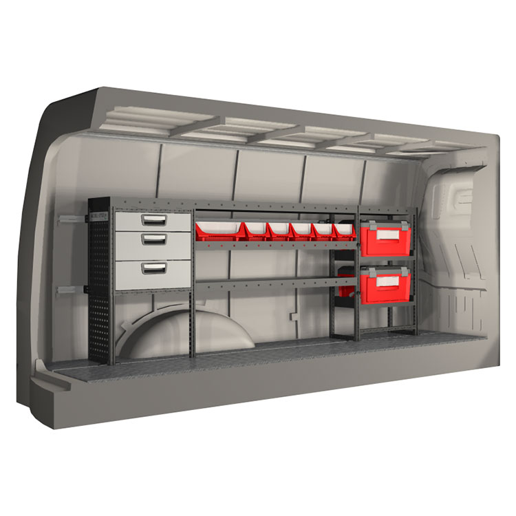 The racking has been specially designed to ensure the optimum fit to the vehicle, as well as the best possible functionality and safety. It has been developed for professional use, is flexible and is intended for service jobs in various types of business. All shelves are equipped with rubber mats, and all drawers with foam plastic liners. Assembly material is included.