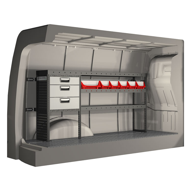 The racking has been specially designed to ensure the optimum fit to the vehicle, as well as the best possible functionality and safety. It has been developed for professional use, is flexible and is intended for service jobs in various types of business. All shelves are equipped with rubber mats, and all drawers with foam plastic liners. Assembly material is included.