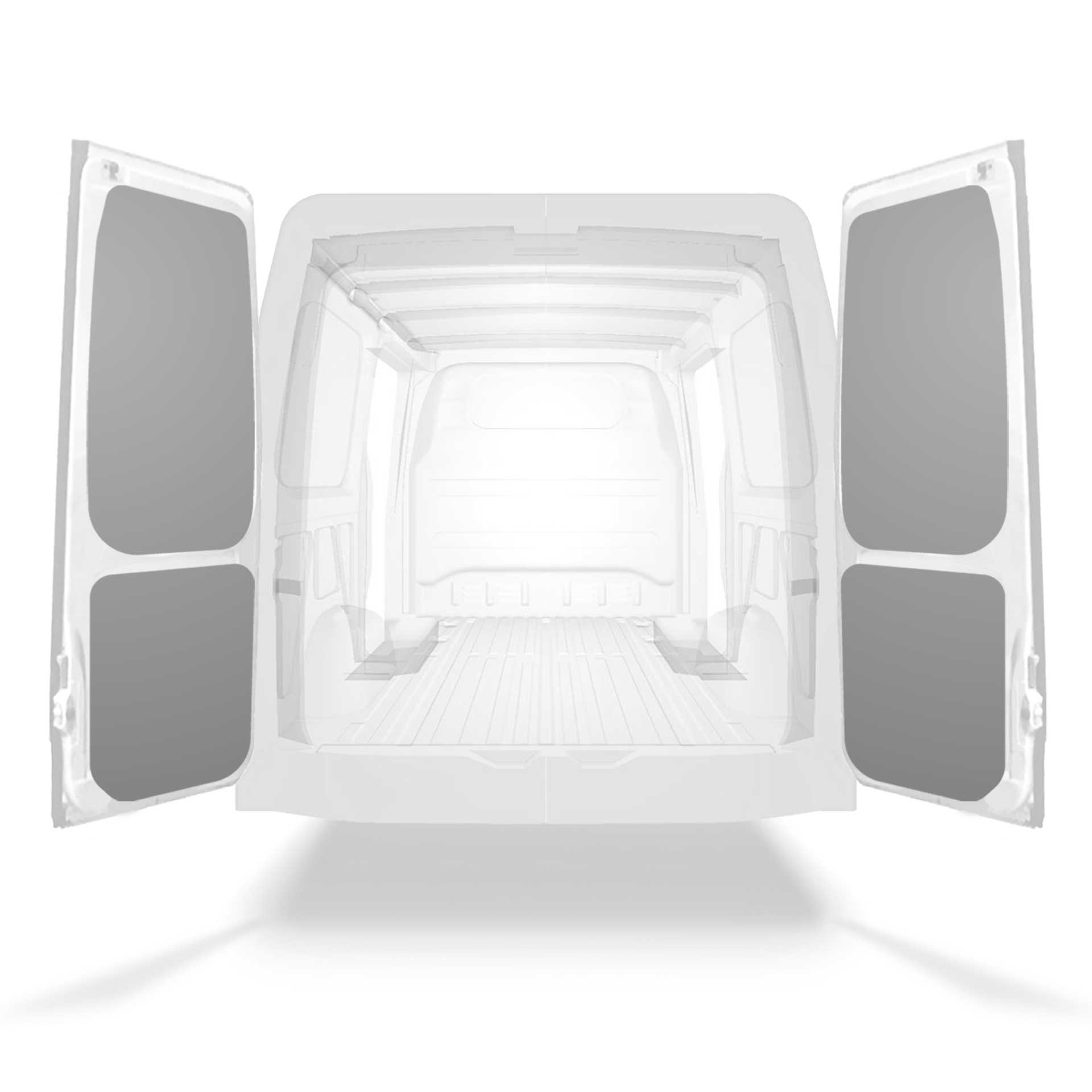 Revêtement de parois léger pour portes arrières d’une Mercedes Sprinter avec doubles portes. Conçus pour offrir une finition professionnelle à l’intérieur, les revêtements de porte préservent l’utilitaire et se nettoient facilement.