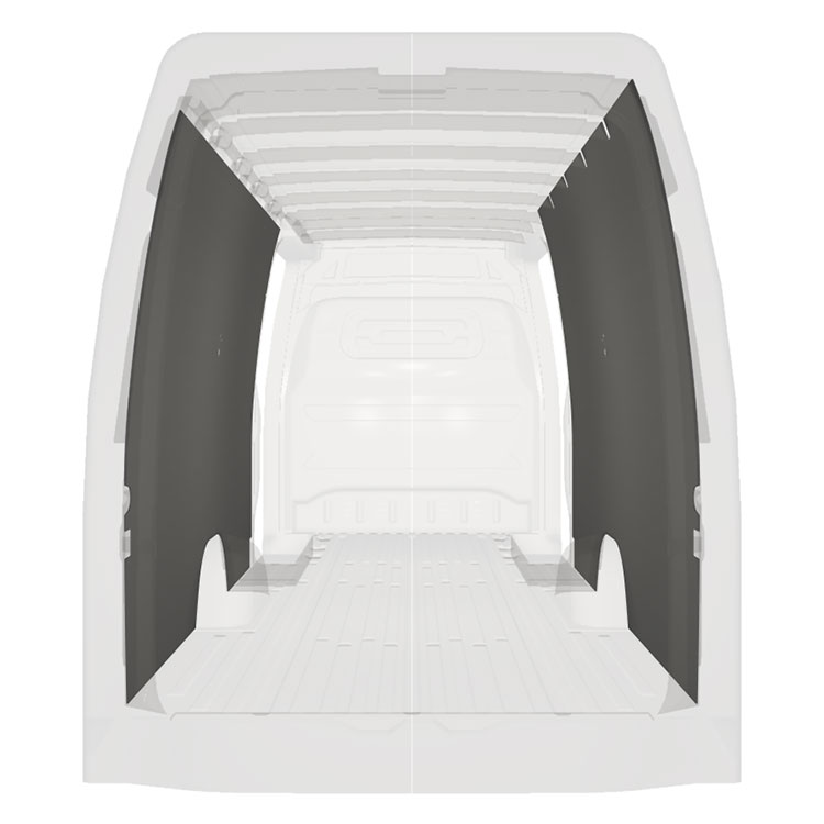 Revêtement entièrement léger pour les parois intérieures d’une Mercedes Sprinter avec doubles portes latérales. Les parois créeront un environnement professionnel lumineux et convivial et se nettoient facilement.