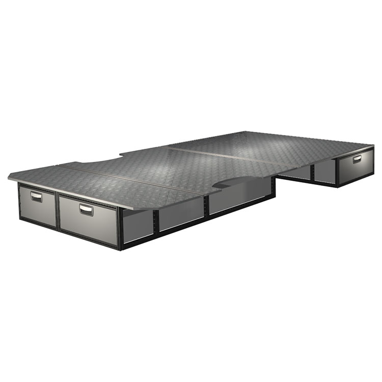 The kit is designed to be fitted on top of a Modul-Floor, utilizing the floor rails for a non-intrusive installation. The double floor is equipped with rails for easy installation of vehicle racking, and edging strips for a nice finish.