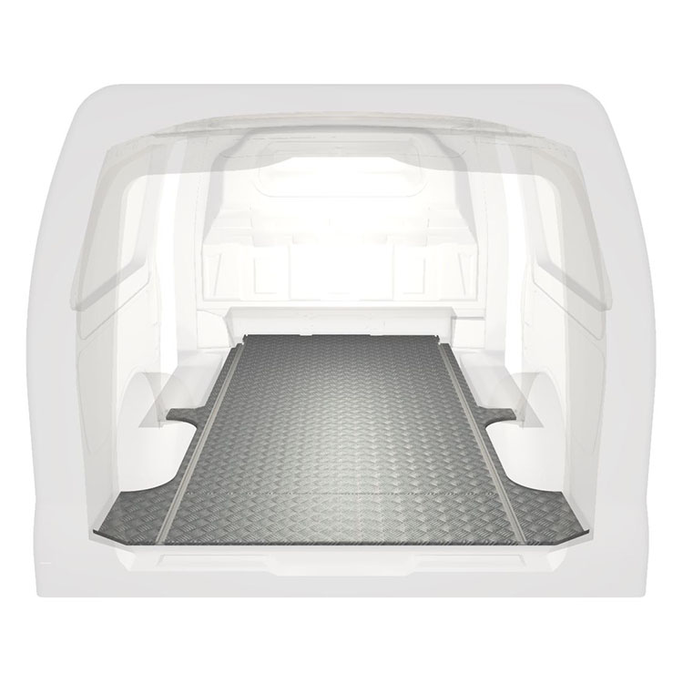 Plancher très long léger et robuste pour une Mercedes Vito avec une plaque de roulement en aluminium antidérapant et des rails de chargement (longitudinaux) pour une installation rapide et sûre des systèmes de rayonnage et autres accessoires.