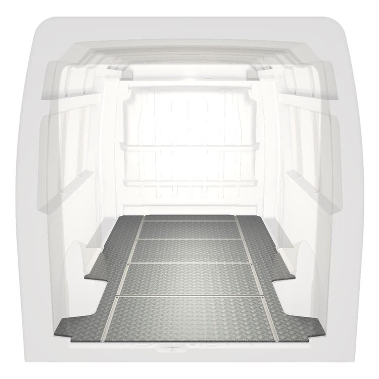 Plancher léger et robuste avec rails transversaux pour une Citroën Jumper / Peugeot Boxer / Fiat Ducato avec une plaque de roulement en aluminium antidérapant et des rails de chargement (longitudinaux et transversaux) pour une installation rapide et sûre des systèmes de rayonnage et autres accessoires.