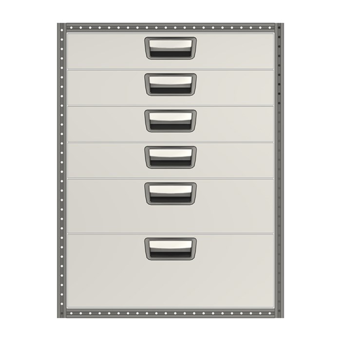 Chaque tiroir est équipé en version standard de glissières sur roulements à billes et sa charge maximale est de 30 kg, tandis que la charge totale par bloc est de 100 kg. Les tiroirs peuvent être ouverts à fond et sont équipés d'arrêtoirs. Pour une utilité maximum, le bloc-tiroirs peut être équipé d'accessoires tels que fond en mousse, séparations et casiers en plastique. Afin d'optimiser le poids, des tôles de fermeture acier et des panoplies sont disponibles en option.
