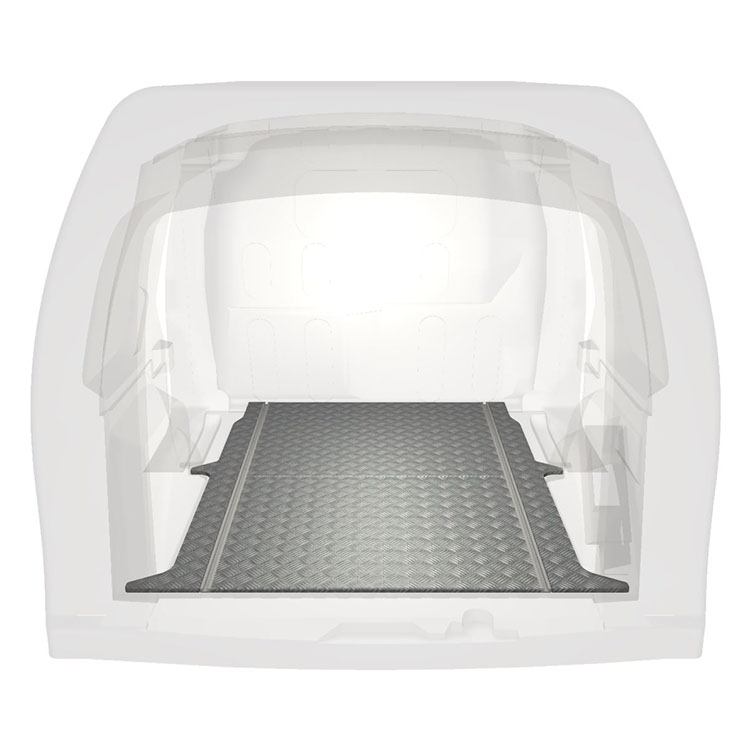 Plancher standard ultra-léger et robuste pour une Mercedes Citan / Renault Kangoo avec une plaque de roulement en aluminium antidérapant et des rails de chargement (longitudinaux) pour une installation rapide et sûre des systèmes de rayonnage et autres accessoires.