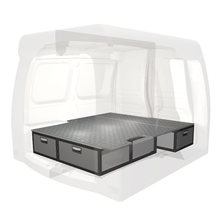 The kit is designed to be fitted on top of a wooden floor. The double floor is equipped with rails for easy installation of vehicle racking, and edging strips for a nice finish.