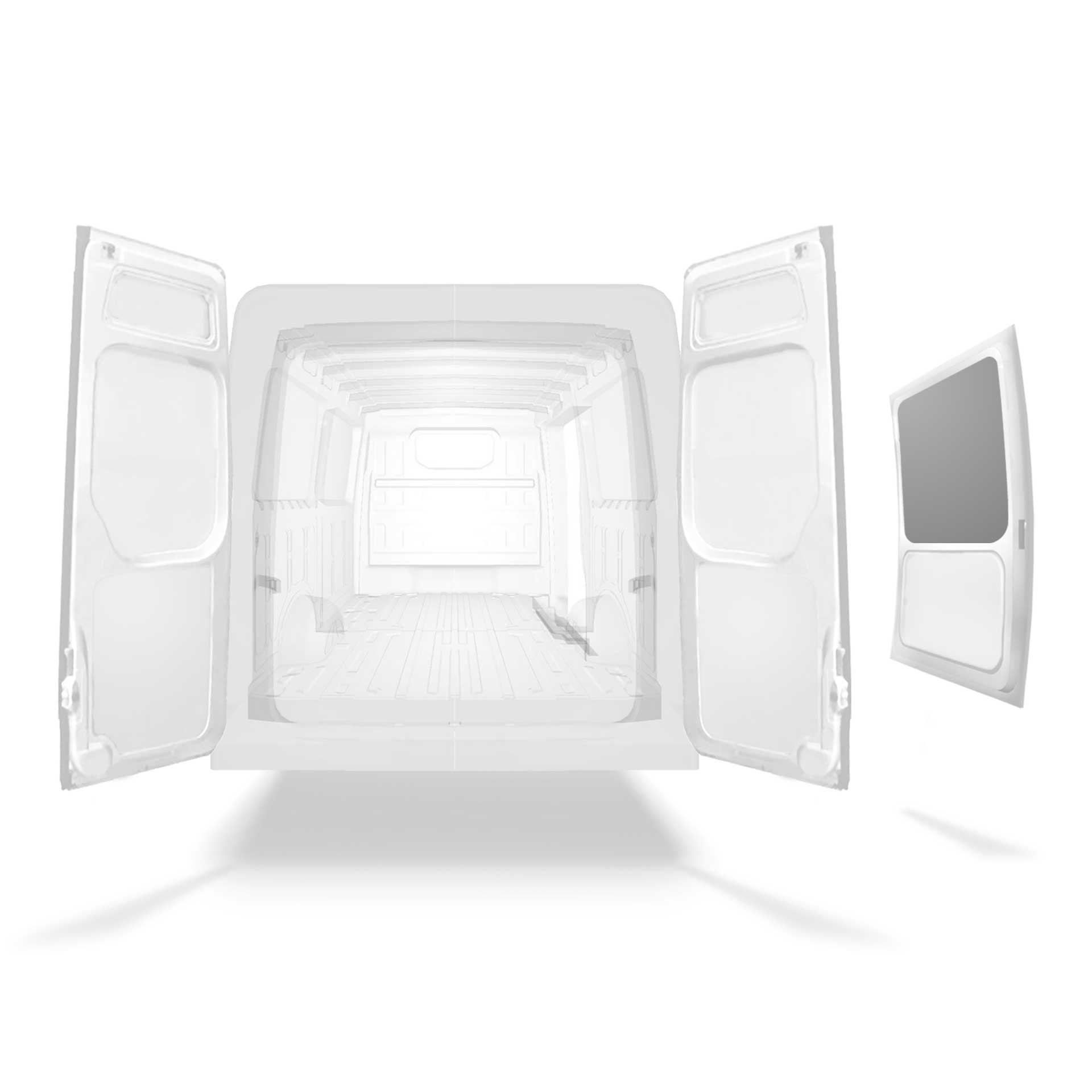 Revêtement léger pour la partie supérieure de la porte latérale d’une Volkswagen Crafter / MAN TGE avec une porte latérale à droite. Le revêtement réduira l’usure normale à l'intérieur et contribuera à maintenir la valeur résiduelle de l’utilitaire.