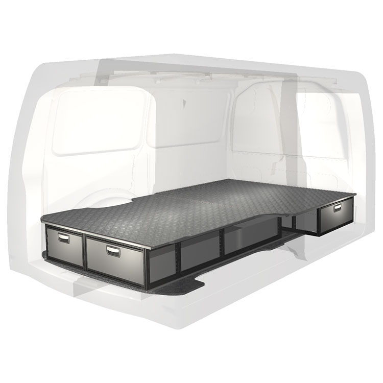 The kit is designed to be fitted on top of a Modul-Floor, utilizing the floor rails for a non-intrusive installation. The double floor is equipped with rails for easy installation of vehicle racking, and edging strips for a nice finish.