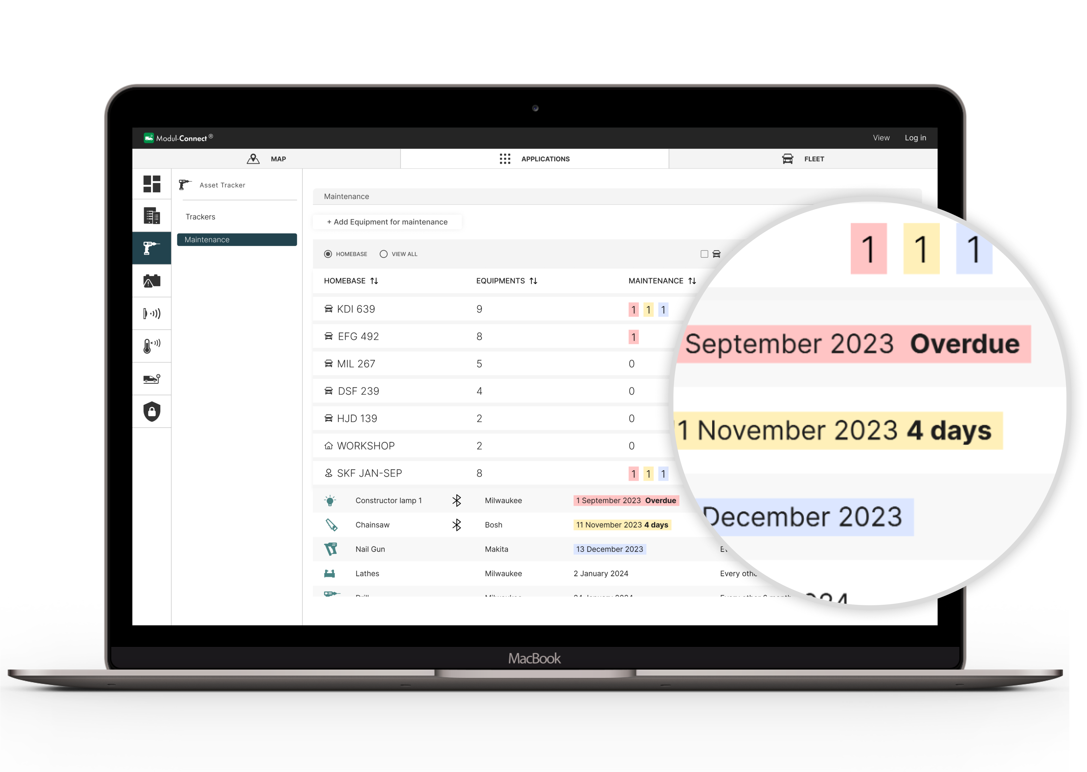 Modul-Connect Customer Portal: Krijg toegang tot het Customer Portal, zodat u het onderhoud van de apparatuur efficiënt kunt beheren en plannen. Stel de frequentie van keuring in om optimale prestaties te garanderen. Het portaal bevat ook een real-time kaartfunctie, zodat u alle apparatuur kunt volgen. Volg de trackers en herken snel ontbrekende apparatuur.