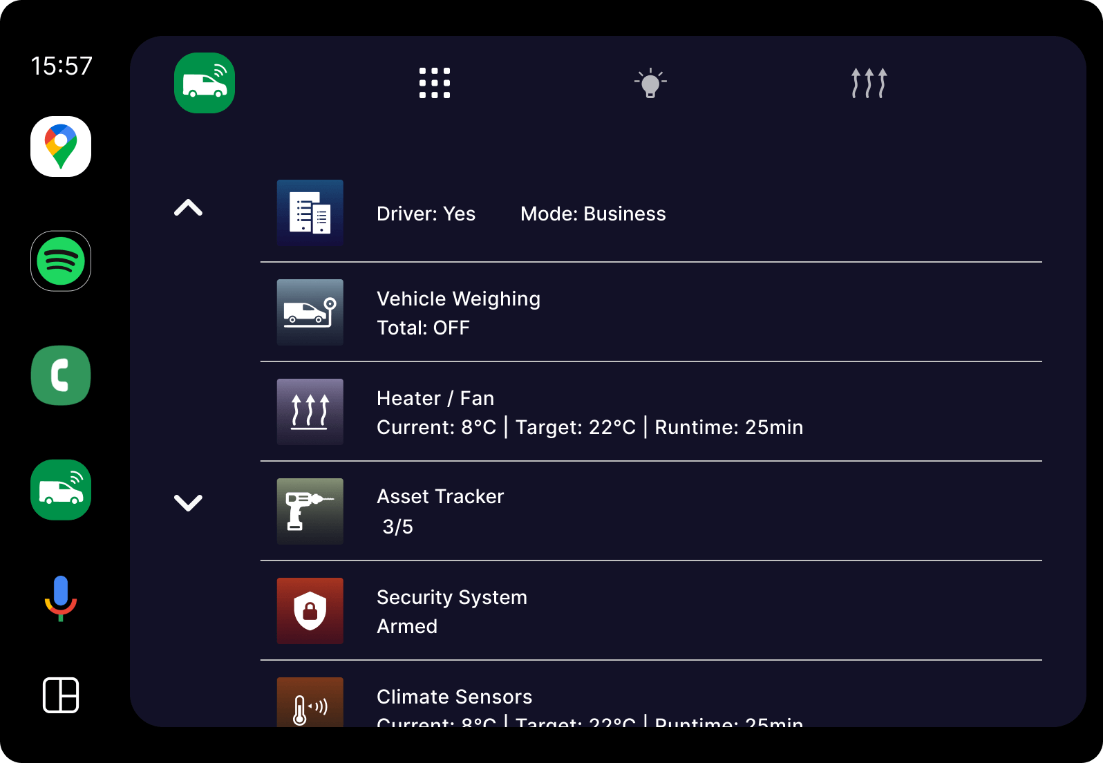 - Monitor: Voertuigklimaat, accuspanning, voertuiggewicht, activa