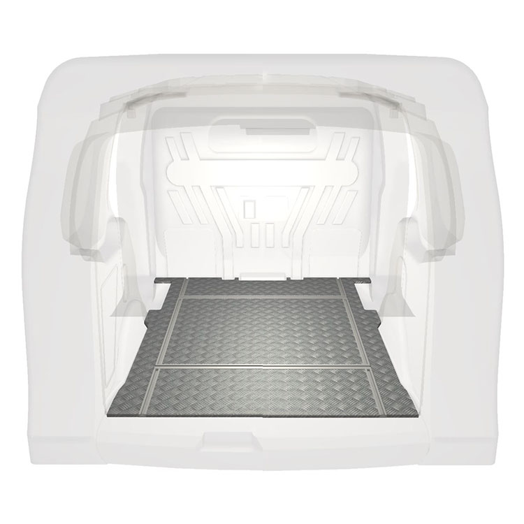 Lichtgewicht, robuuste bestelwagenvloer met dwarsrails voor een Ford Transit Connect met antislip-instaplijst van aluminium en cargorails (in de lengte en in de breedte) voor een snelle en veilige installatie van inrichtingssystemen en andere accessoires.