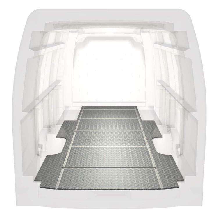 Lichtgewicht, robuuste bestelwagenvloer met dwarsrails voor een Renault Master / Opel Movano / Nissan NV400 met antislip-instaplijst van aluminium en cargorails (in de lengte en in de breedte) voor een snelle en veilige installatie van inrichtingssystemen en andere accessoires.