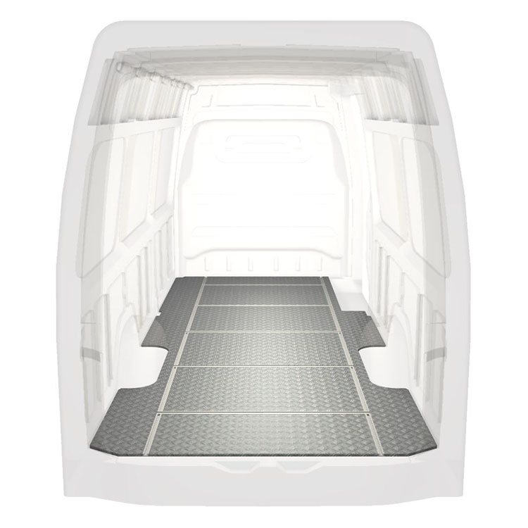 Lichtgewicht, robuuste bestelwagenvloer met dwarsrails voor een Mercedes Sprinter met antislip-instaplijst van aluminium en cargorails (in de lengte en in de breedte) voor een snelle en veilige installatie van inrichtingssystemen en andere accessoires.