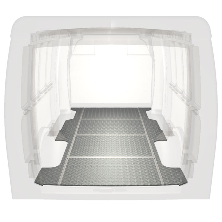 Lichtgewicht, robuuste bestelwagenvloer met dwarsrails voor een Iveco Daily met antislip-instaplijst van aluminium en cargorails (in de lengte en in de breedte) voor een snelle en veilige installatie van inrichtingssystemen en andere accessoires.