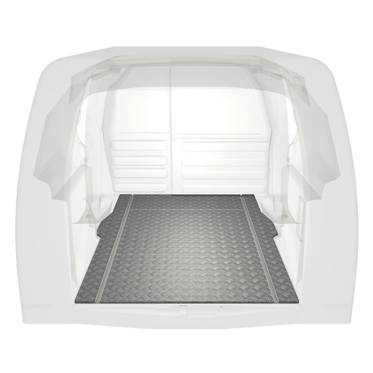 Lichtgewicht, robuuste standaard-bestelwagenvloer voor een Citroën Berlingo/Peugeot Partner met antislip-instaplijst van aluminium en cargorails (in de lengte) voor een snelle en veilige installatie van inrichtingssystemen en andere accessoires.