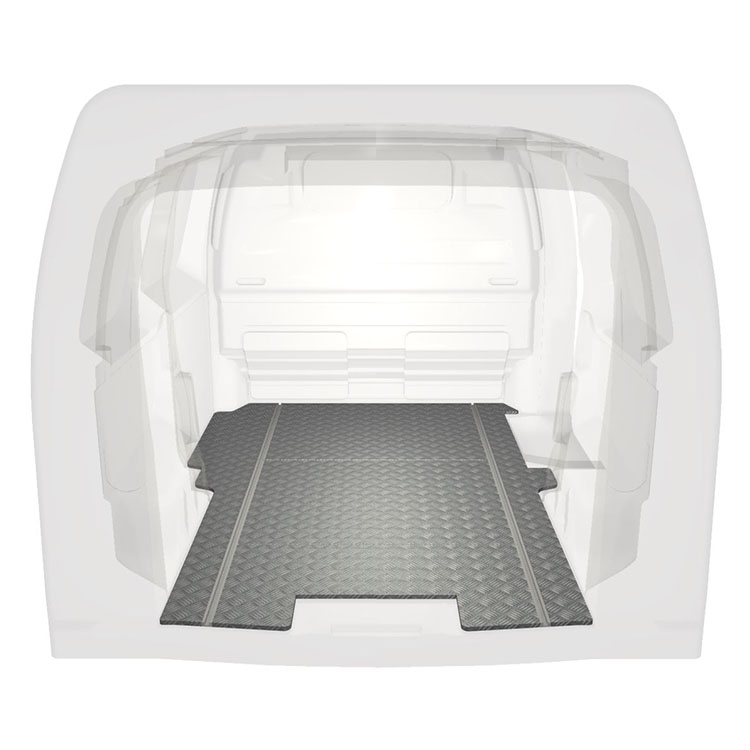Lichtgewicht, robuuste standaard-bestelwagenvloer voor een Citroën Jumpy / Peugeot Expert / Toyota ProAce met antislip-instaplijst van aluminium en cargorails (in de lengte) voor een snelle en veilige installatie van inrichtingssystemen en andere accessoires.