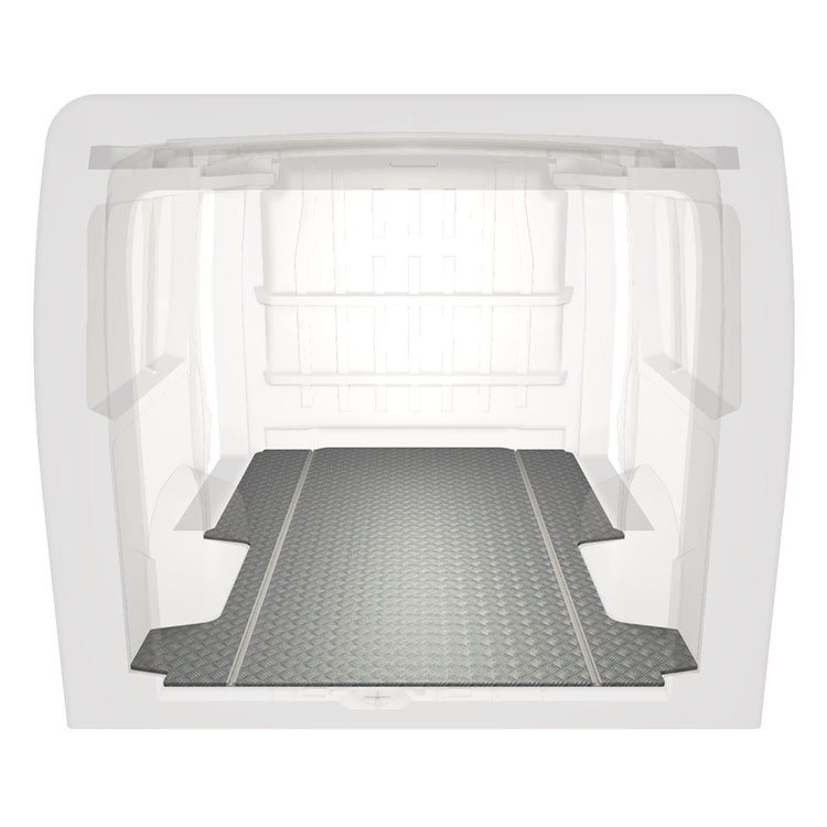 Lichtgewicht, robuuste extra lange vloer voor een Citroën Jumper / Peugeot Boxer / Fiat Ducato met antislip-instaplijst van aluminium en cargorails (in de lengte) voor een snelle en veilige installatie van inrichtingssystemen en andere accessoires.